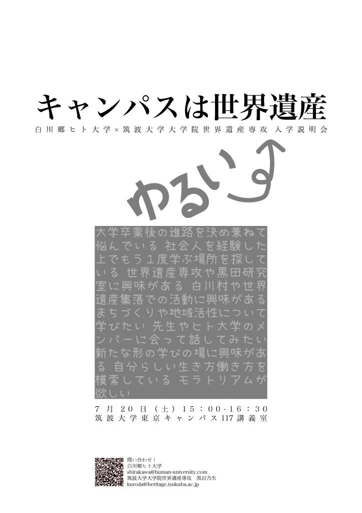ヒト大学と筑波大学院世界遺産専攻の「ゆるい入学説明会」東京開催のお知らせ2019.06.27/カテゴリ: News以下の要領で、入学説明会行います。興味ご関心ある方は是非お越しください。参加申し込みは不要です。 日時:7月20日(土)15:00〜16:30 場所:筑波大学東京キャンパス 117講義室 関連ページはコチラ https://www.heritage.tsukuba.ac.jp/wp-content/uploads/2019/06/ゆるい説明会ちらし.jpg 3567 2522 heritage-user https://www.heritage.tsukuba.ac.jp/wp-content/uploads/2025/04/logo02.png heritage-user2019-06-27 11:37:242019-06-27 11:41:24ヒト大学と筑波大学院世界遺産専攻の「ゆるい入学説明会」東京開催のお知らせ