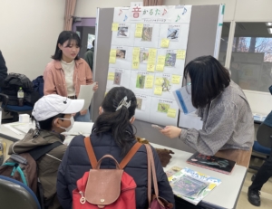 つくば市に生息する生き物の鳴き声を読み札にした「音かるた」というゲームを通して、生き物が発する音をよく聴き、それがどう聞こえるのかを自由に表現する体験を行いました。聴覚を用いた自然観察を促すとともに、音の聞こえ方の個人差や表現の工夫を共有することを楽しみました(写真2)。